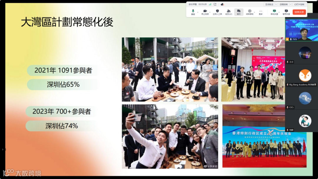 活动迎来了高潮环节。周盼携手园区内两家参与计划的明星港资企业代表——Big Bang Academy和朗思科技,分别介绍了各自公司的发展情况、核心业务、企业文化,并重点发布了针对该计划招募的优质岗位信息,让港青直观了解工作内容与发展前景;求职经验分享与深度互动,最后环节,周盼结合自身经验,分享了在大湾区求职的实用建议和技巧。随后的长达一小时的问答与自由交流时间,线上气氛活跃,港青们就关心的岗位细节、政策落实、职业发展、生活配套等问题踊跃提问,主办方及企业代表均给予了耐心细致的解答。
