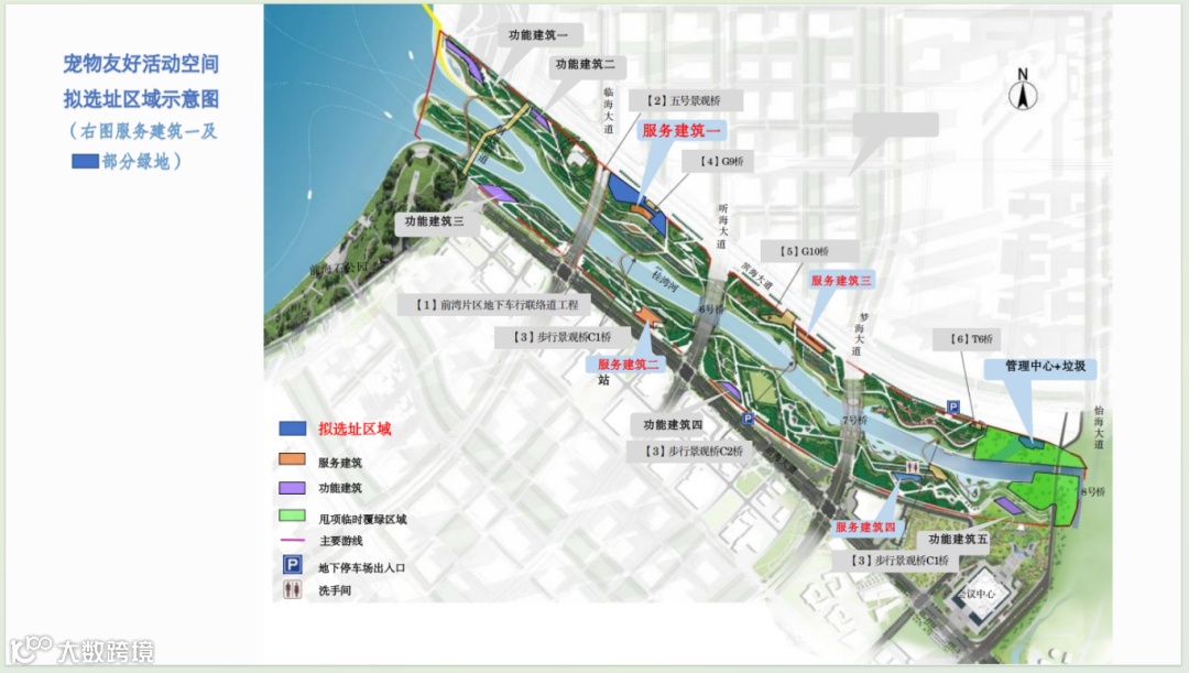 本项目初步规划位于前海桂湾公园服务建筑一及附属周边绿地。详见附件:宠物友好活动空间拟选址范围示意图