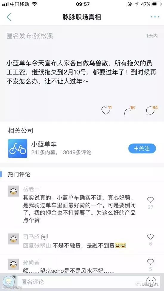 11月15日,有小蓝单车员工在某职场社交平台发布消息称,小蓝单车宣布解散,拖欠员工工资至2018年2月10日。