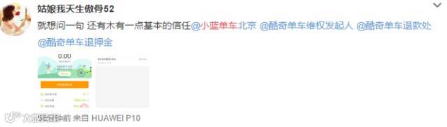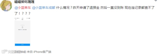还有用户称,小蓝单车APP中的退款信息无故消失,“押金”一栏直接从“退款中”变成“未交押金”状态,但用户并未得到押金返还。而且这种情况还不是孤例。