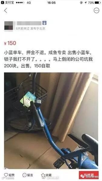 近日,已有未收到退款的用户在网上出售小蓝单车来“抵债”,标价150元一辆。