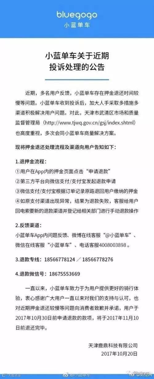 10月20日,小蓝单车曾发布公告称,用户于2017年10月30日之前申请的退款,将于2017年11月10日前退还完毕。