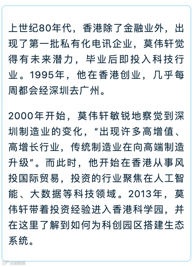 “香港未来的产业布局将呈现‘北科创、南金融’格局,我在河套待了3年,完成了阶段性任务。前海也是深港合作最紧密区域之一,来这边可以更好地帮助香港科技发展,促进深港融合。”2024年9月,莫伟轩成为前海梦工场运营公司总经理。