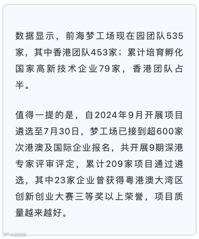 目前,梦工场与香港最具规模的两大科技产业园——香港数码港和香港科学园也逐步有了更密切的合作。比如,已与数码港开展了项目互推机制,209家通过梦工场遴选的项目中,就有53家来自上述两个园区。以国家级专精特新“小巨人”睿思芯科为代表的一批梦工场入驻企业则在香港落地或计划落地。而这种“双向奔赴”,也将推动深港两地技术、资本、人才等要素加速流动。