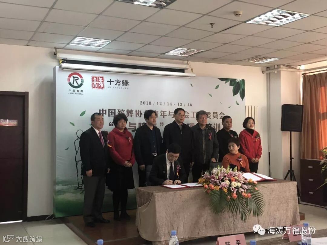 中国殡葬协会青年与社会工作委员会主任 刘鹏与十方缘 老人心灵呵护 创始人、北京十方缘公益基金会党支部书记 王桂芹签署战略合作协议。