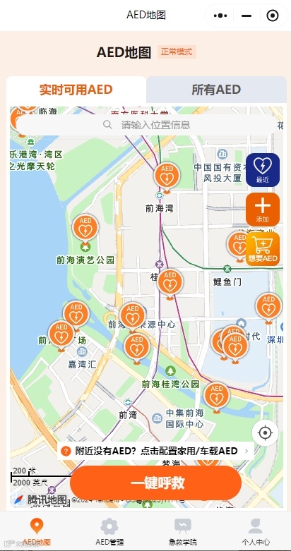 近年来,突发疾病导致的死亡案例有所增加。根据《国家卫生健康委办公厅关于印发公共场所自动体外除颤器配置指南(试行)的通知》要求,为了完善游客安全保障措施,前海产发集团已在前海公园范围内完成六台自动体外除颤器(AED)装置配置,具体包括前海石公园两台、演艺公园一台、桂湾公园三台。