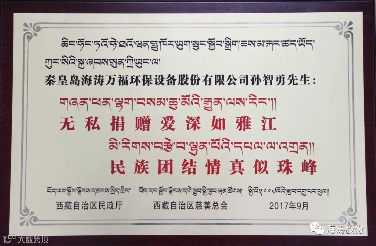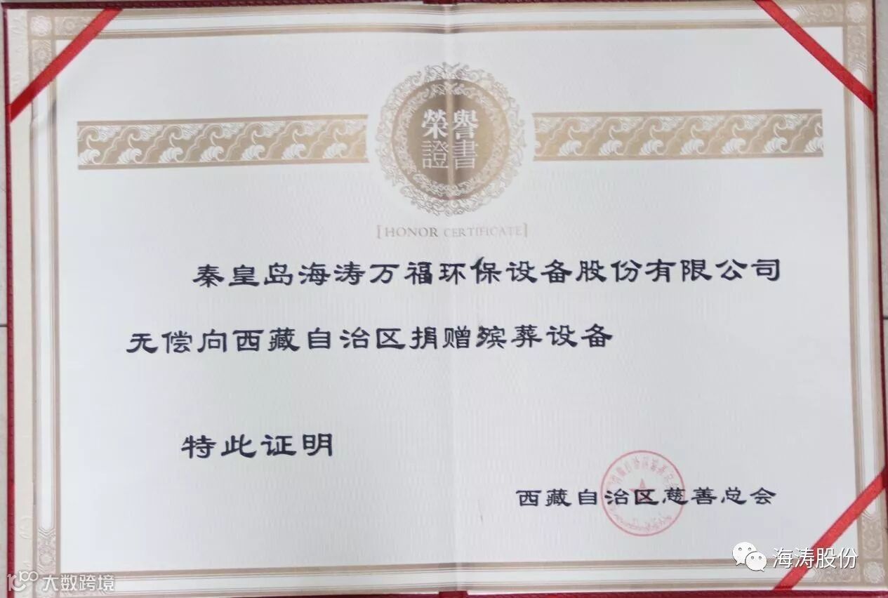 导读:秦皇岛海涛股份公司向西藏自治区赠送殡葬设备获得荣誉证书