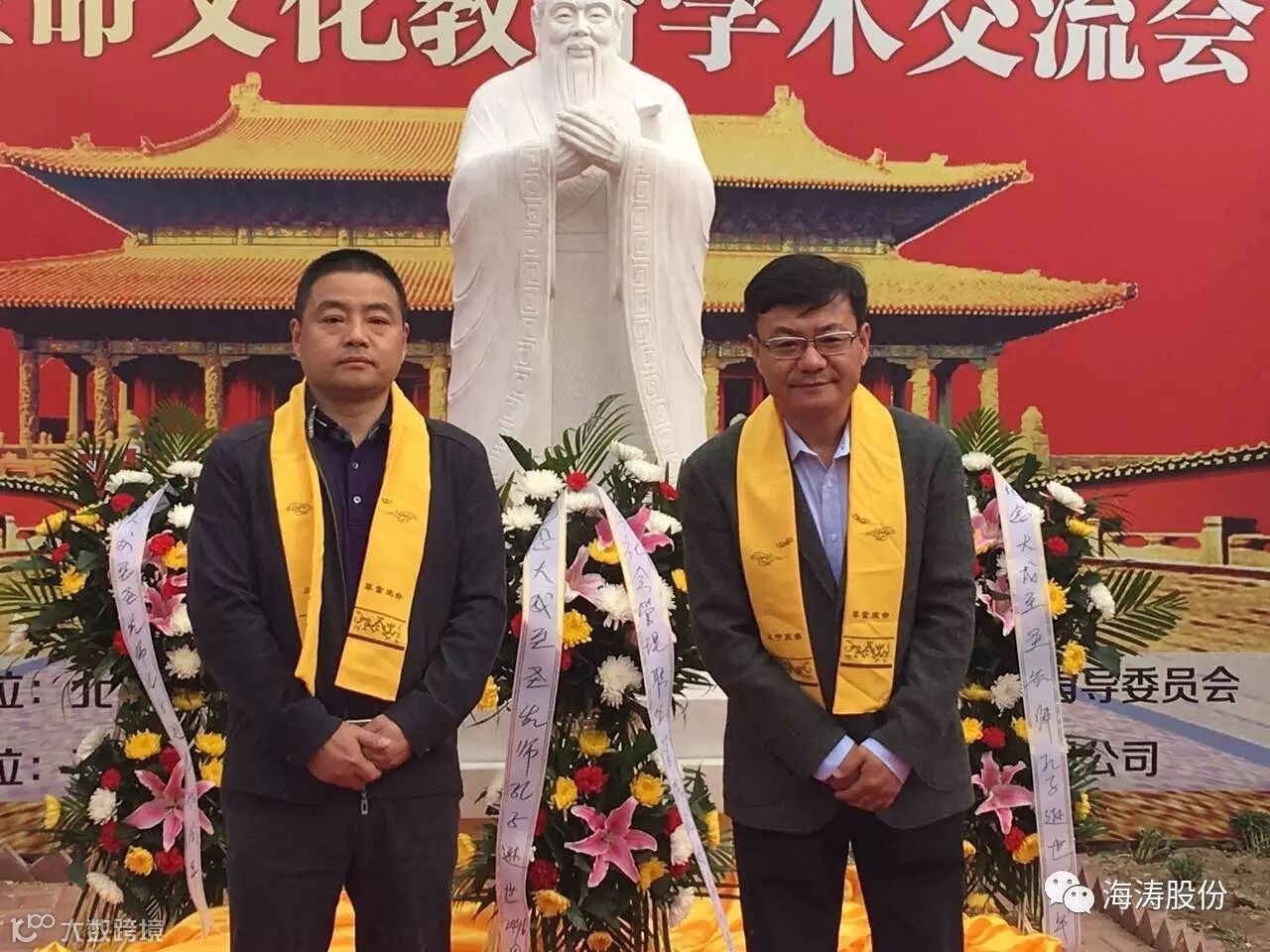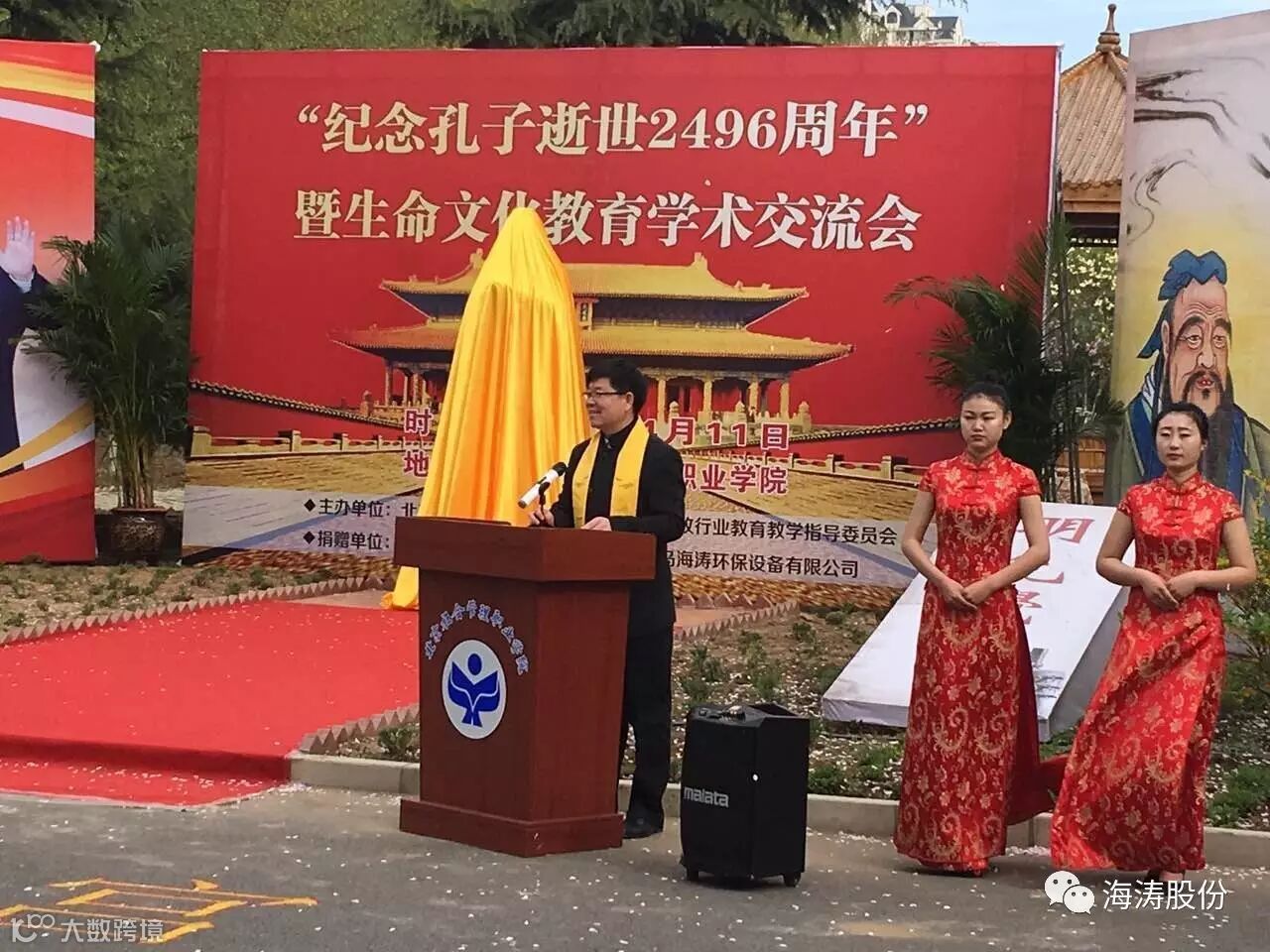 从左至右:北京社会管理职业学院党委常务副书记程伟、北京社会管理职业学院院长、党委书记邹文开、秦皇岛海涛万福环保设备股份有限公司董事长兼总经理孙智勇先生、河北古中山陵园总经理赵志国博士共同为孔子雕像揭幕。