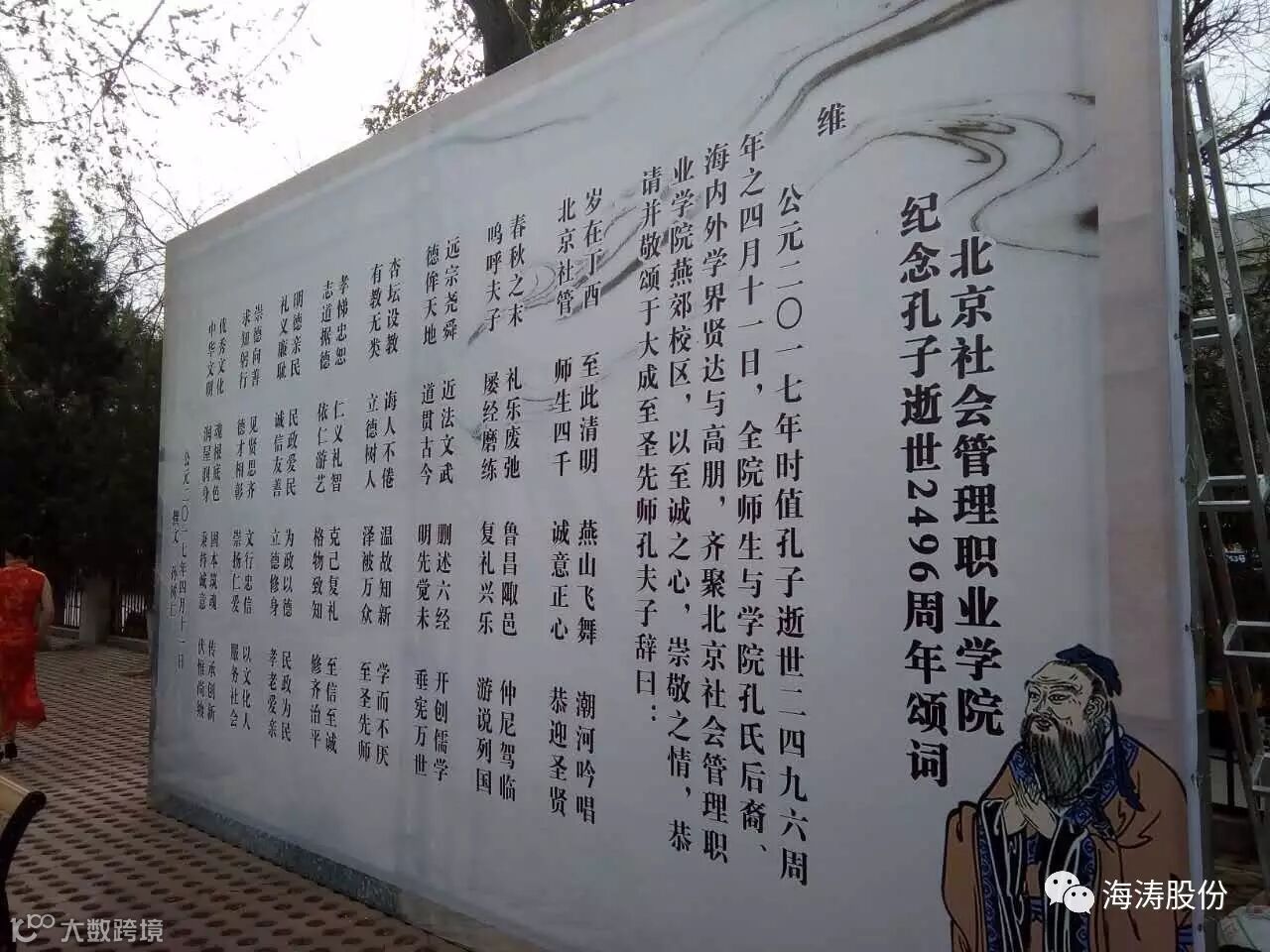 今天,公元2017年4月11日,是儒家的创始人孔子逝世2496年的纪念日,我们在北京社会管理职业学院校园内设立伟大的思想家、教育家、政治家、儒家学派创始人孔子的雕像,旨在不断增强中华优秀传统文化的生命力和影响力,创造中华文化新辉煌。