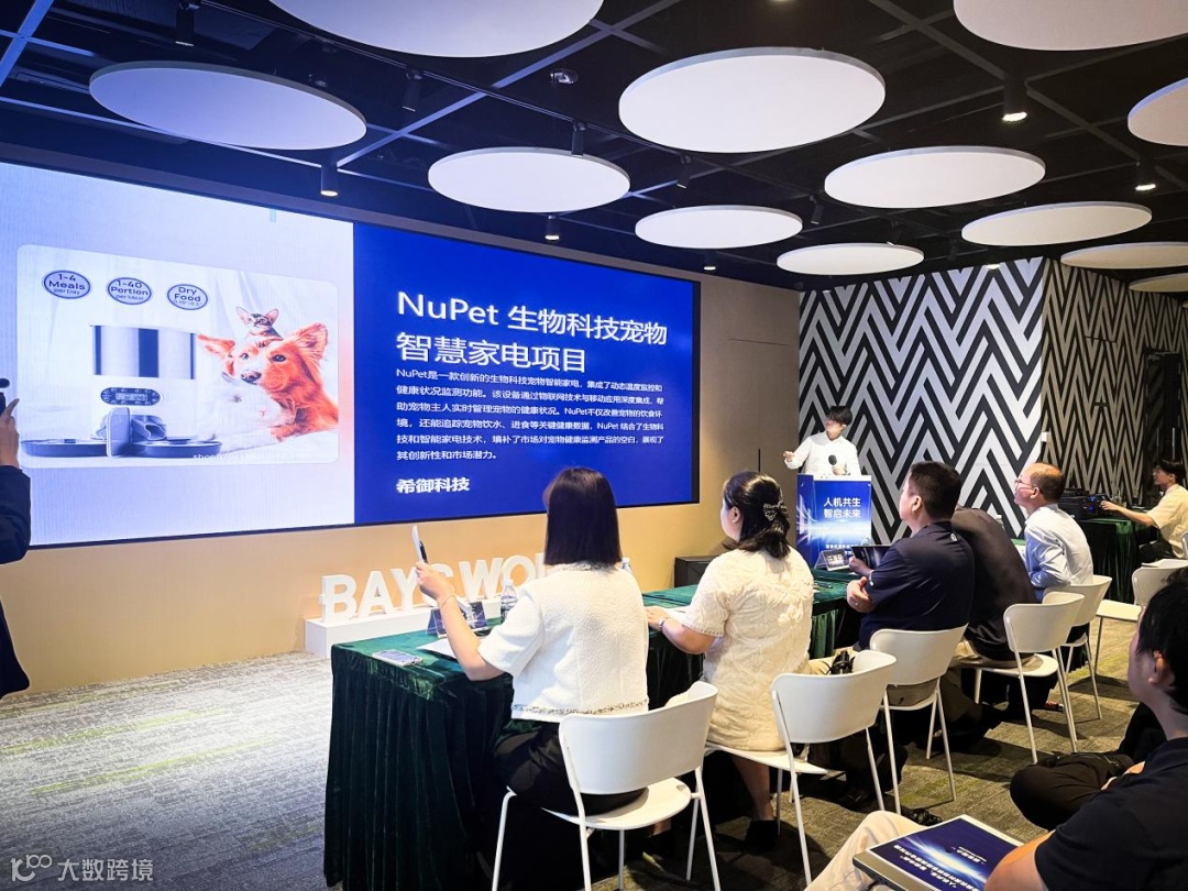 随后,四个创业团队——希御科技、万领钧科技、数能觉醒和盘石家族数科分别进行了精彩的项目展示。这些项目涵盖了宠物智能家居、海外人力资源服务、利用大数据和AI优化跨境电商经营决策以及数据赋能中小企业转型的区块链项目。