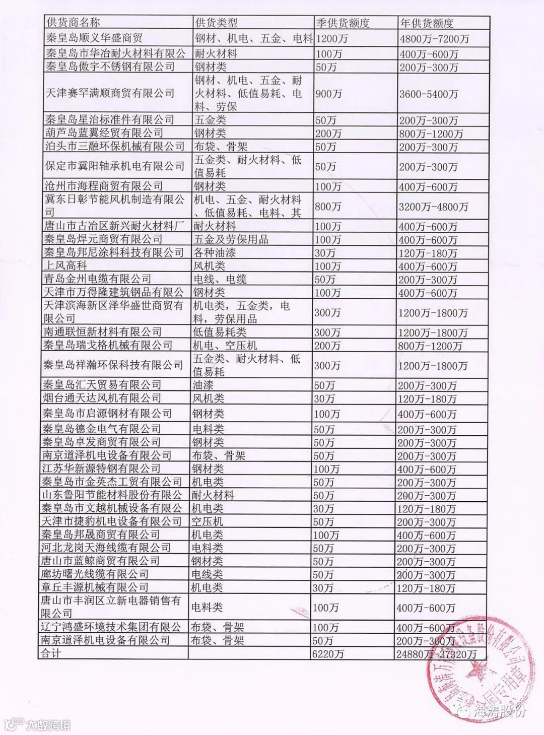 海涛股份公司供应商招标会完美收官!经过评审组的评审,共有40家供应商中标海涛股份公司成为特许供应商,名单如下表