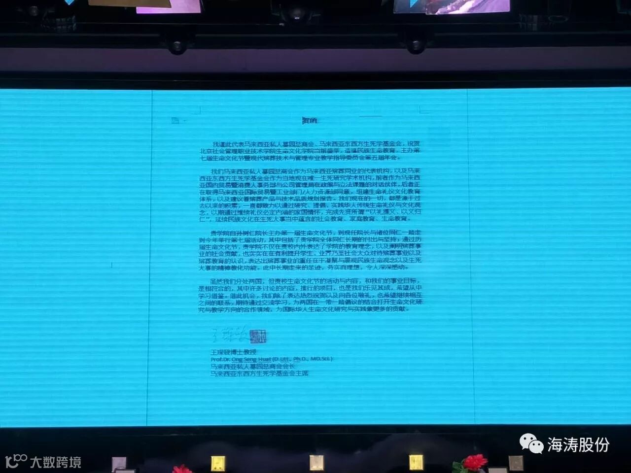 图为:马来西亚殡葬协会王琛发主席发来贺词