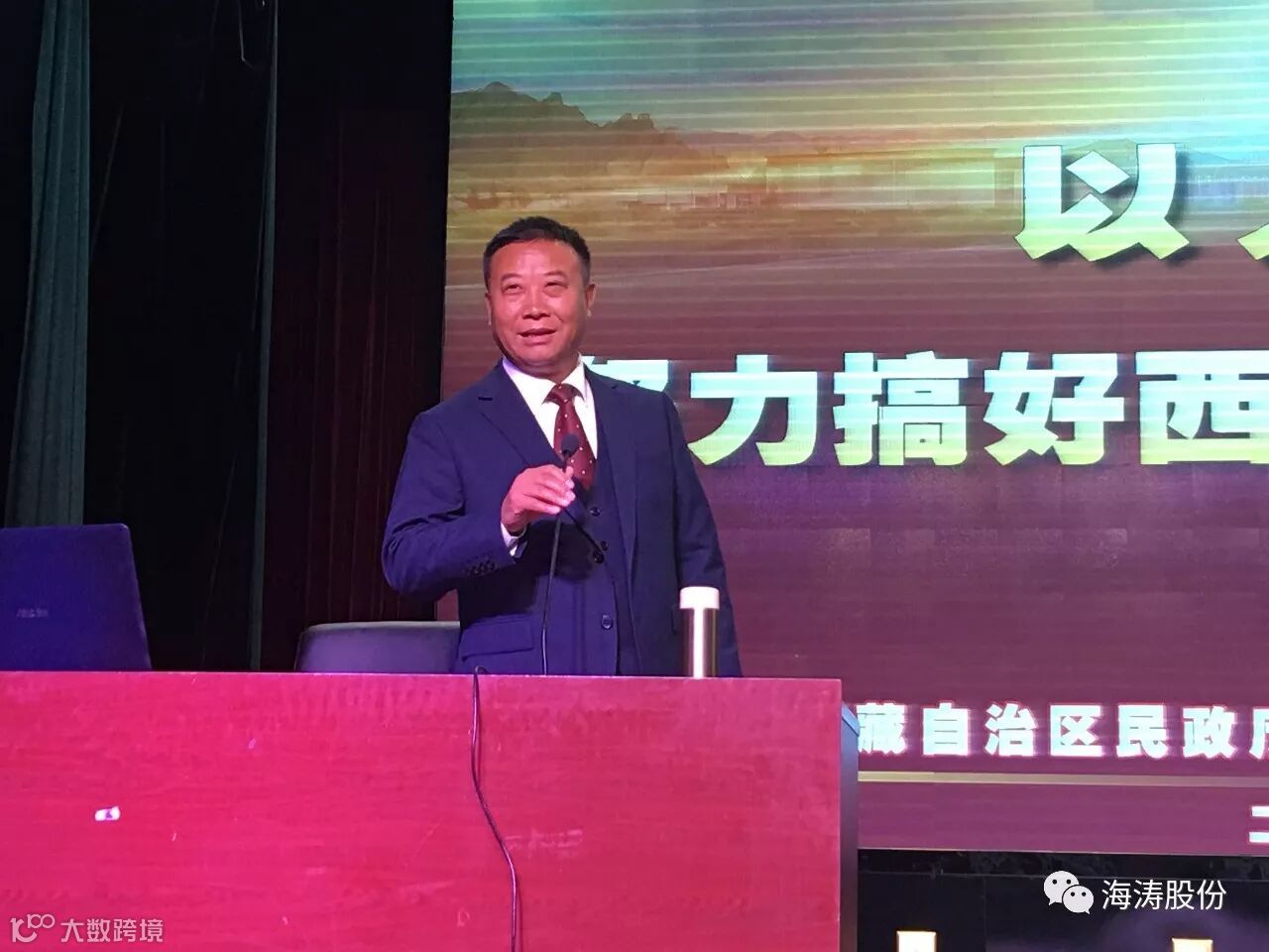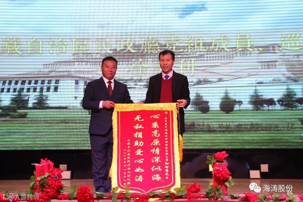 图为:西藏自治区民政厅党组成员、巡视员徐家利向秦皇岛海涛万福环保设备股份有限公司董事长孙智勇授锦旗