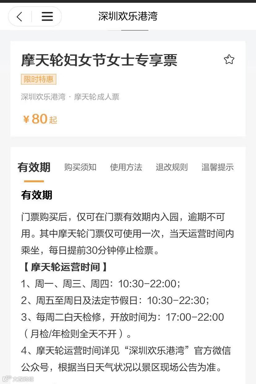 80元可抢“摩天轮妇女节女士专享票”,3月8日-3月10日,指定日期可用,限坐1圈,感受超乎寻常的高空魅力,打卡亚洲最大的摩天轮,深圳人自己的浪漫新地标。