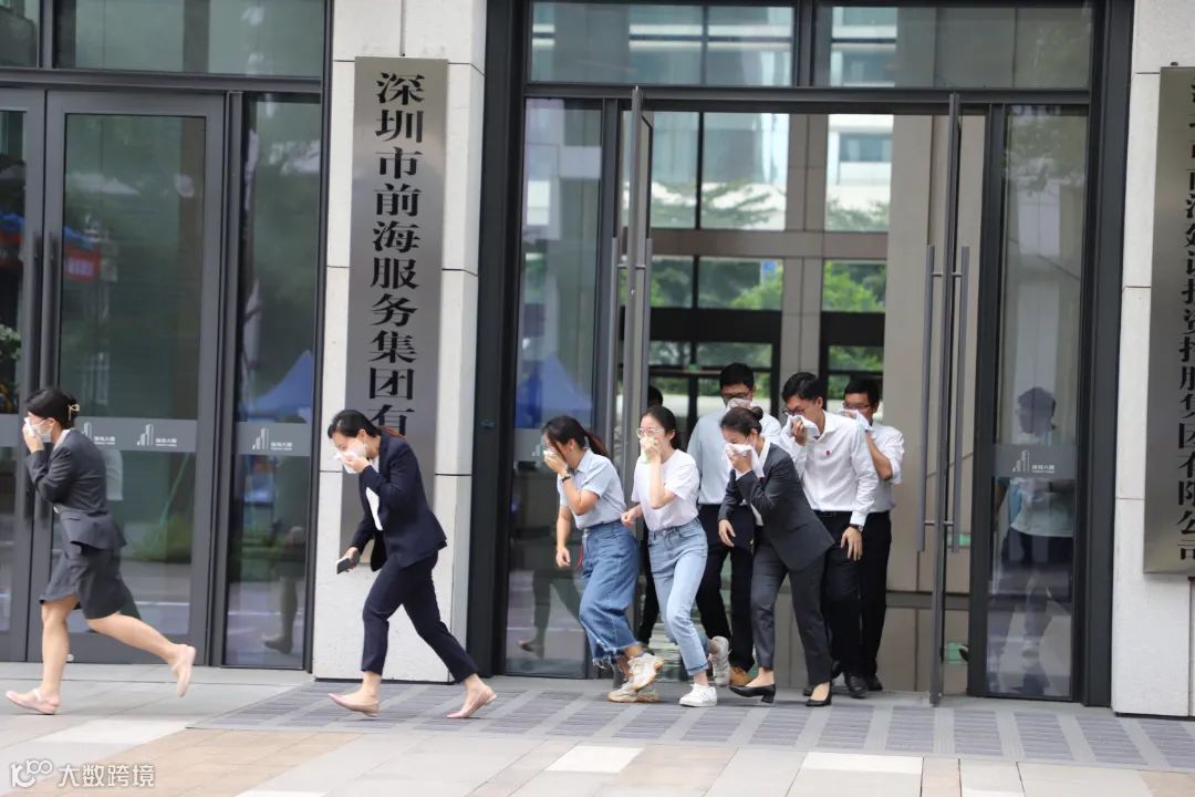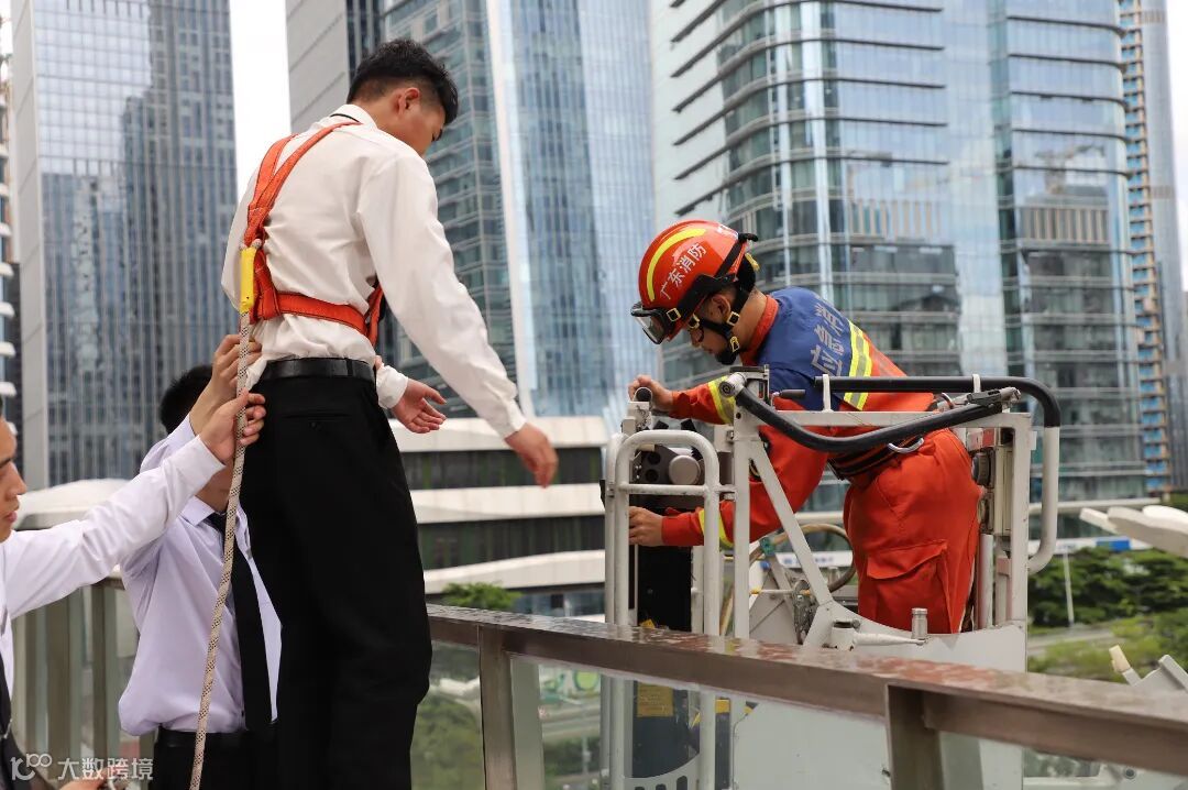 随后,演练人员展开前海大厦高层模拟火灾救援演练。本次演练覆盖了发现险情、报警、扑救、人员疏散、消防云梯车高层火灾救援等流程。演练模拟了前海大厦5层因动火作业操作不当引发火灾,导致区域报警信号启动,报警信号发送中控室,值班人员核实警情,发现有受困人员,迅速启动应急预案。