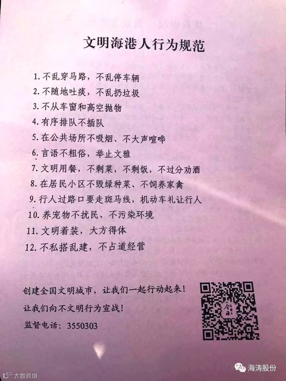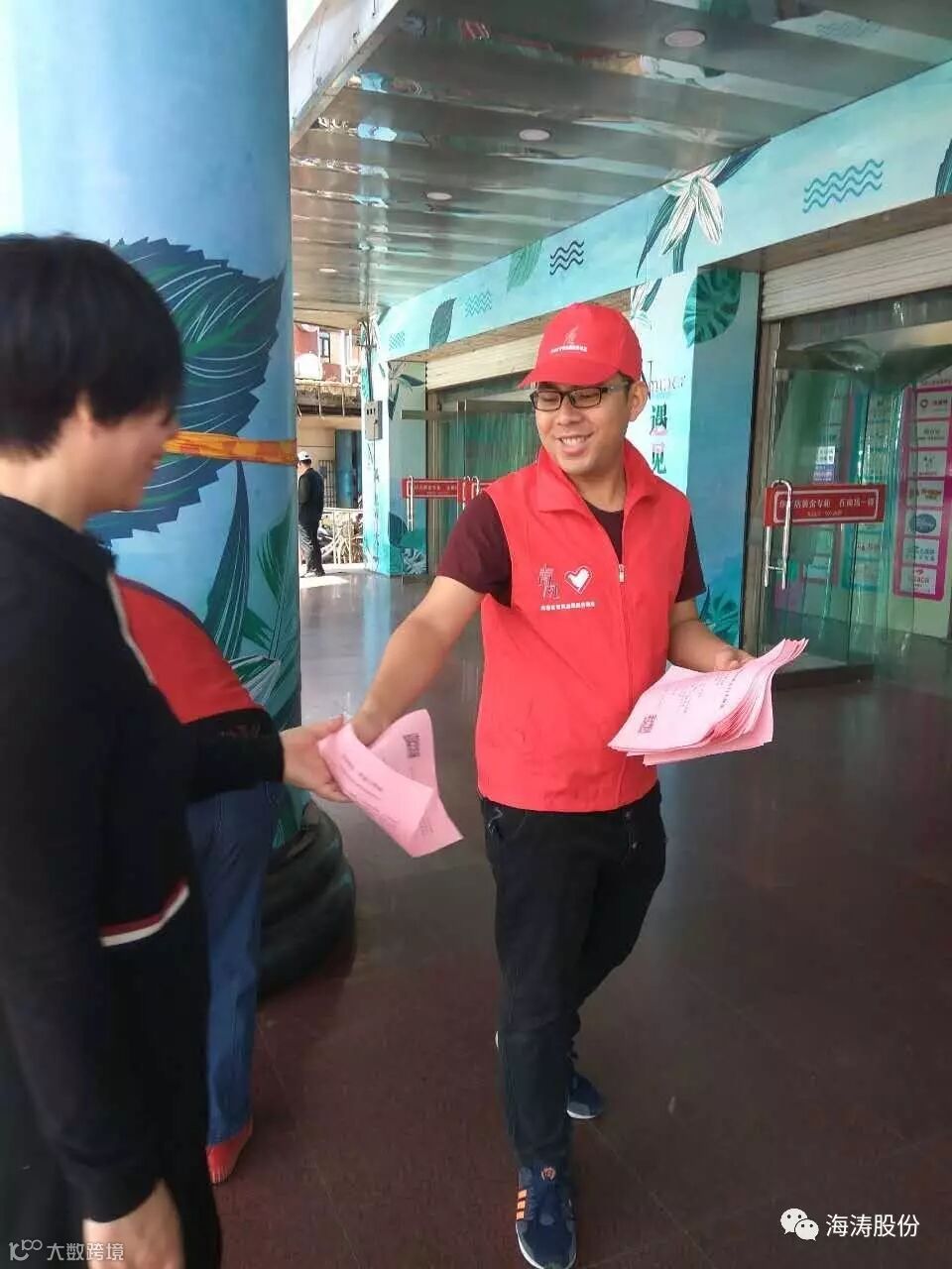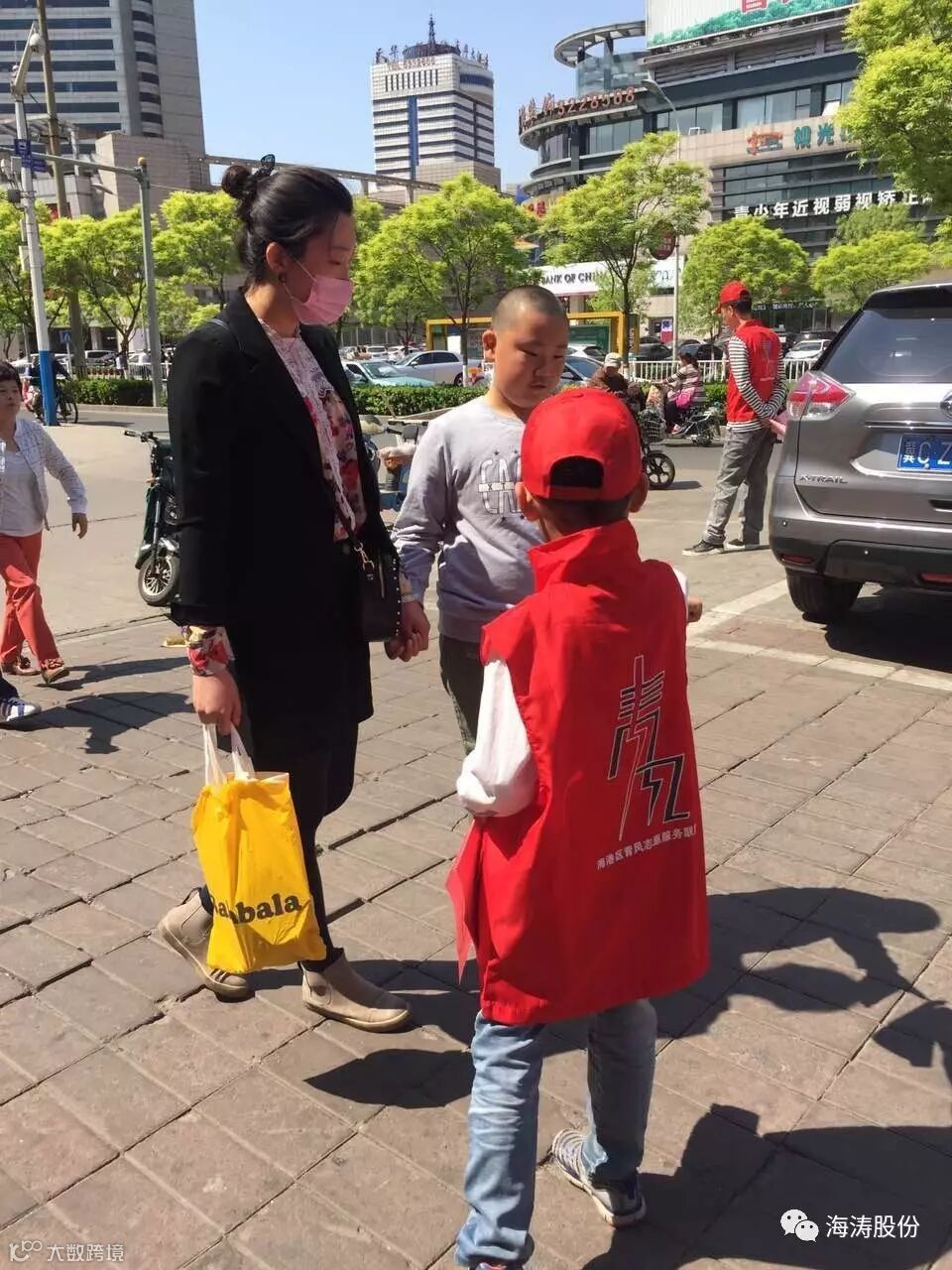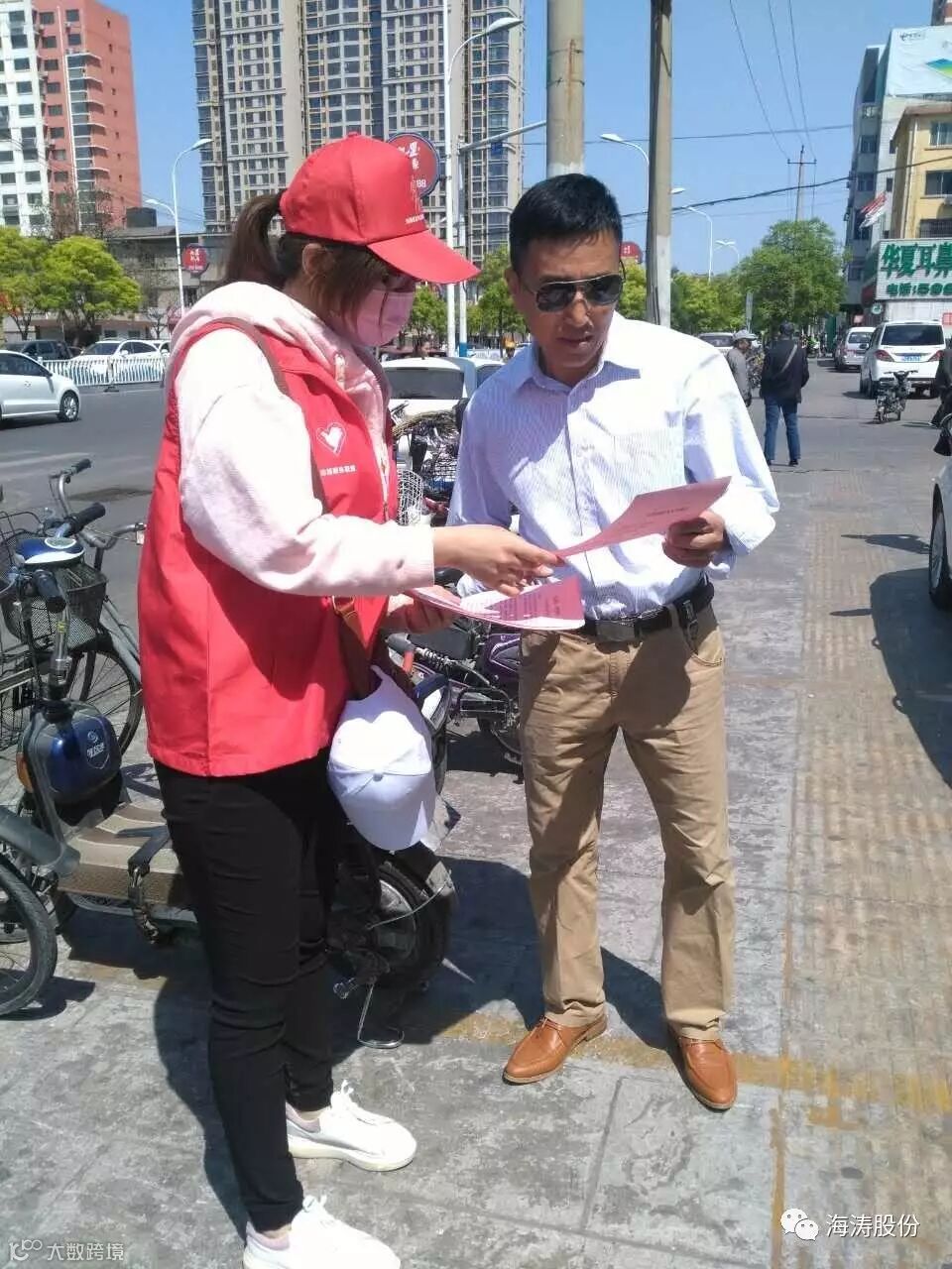 上午10点,志愿者们穿着红色马甲,带着小红帽,来到之前分配好的地点,开始人们发放“文明海港人行为规范”。