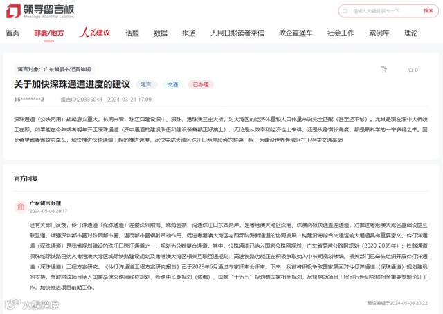 广东省有关部门近日回复:将积极争取国家层面对伶仃洋通道(深珠通道)规划建设的支持,争取将该项目纳入国家高速公路网线位规划、铁路中长期规划(修编)、国家“十五五”规划等国家相关规划。
