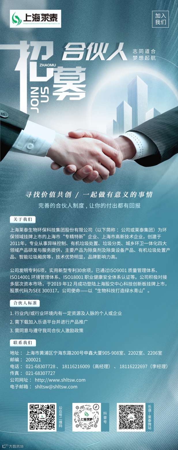 上海莱泰集团的愿景和目标是以全球领先的生物科技,成就莱泰百年品牌。现诚邀价值观一致,志愿投入环保事业,愿意建立长期合作发展关系的合伙人,共同拓展市场实现人生的理想与价值。