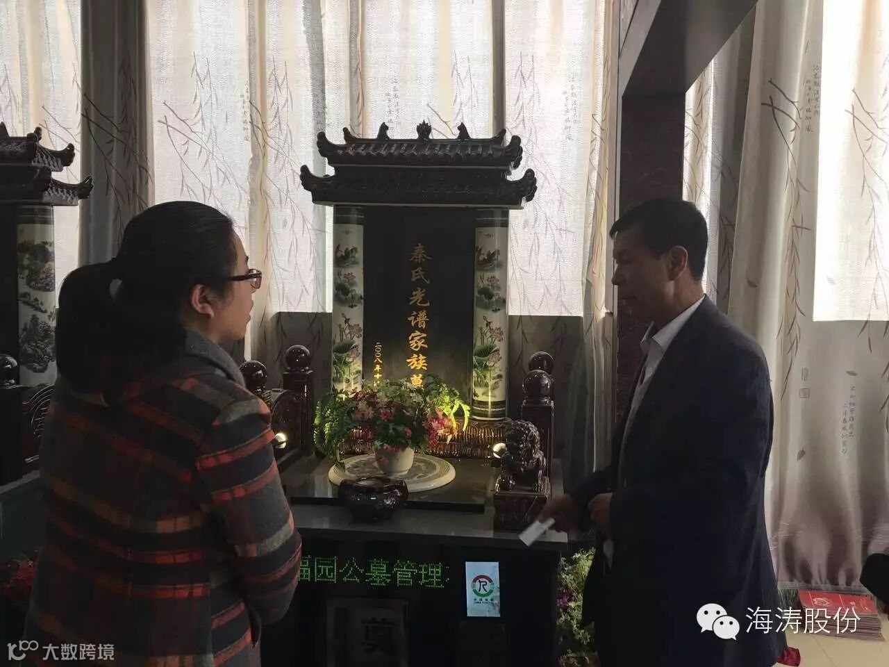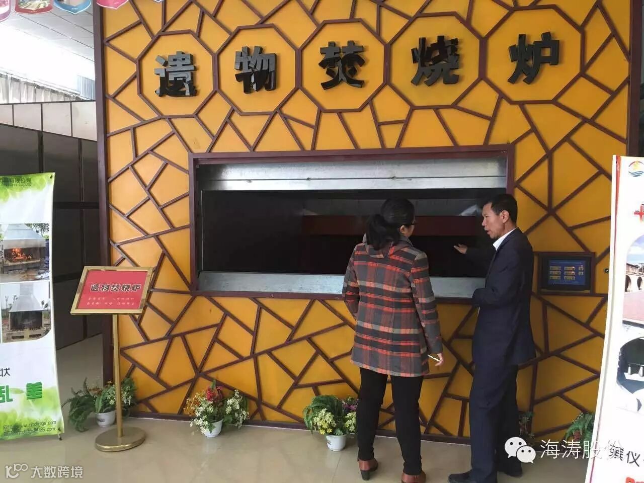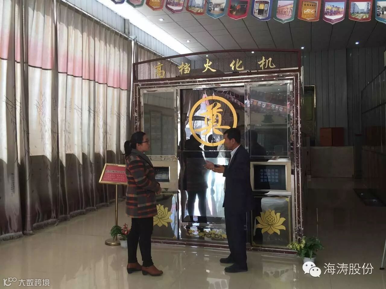 孙董事长还为董老师介绍了“高档捡灰火化机”,它的特点是自动进尸、火化、自动将骨灰装进骨灰盒;“十二生肖祭祀园”可以按逝者属相选择祭祀,每个祭祀门都配有点火器,在祭祀过后将祭祀物品放入炉口,炉壁360度旋转将物品通过消烟除尘设备自动清理掉;“室内公墓全套设备”可容纳五代十八个骨灰盒,很适应国家倡导的家庭成员合葬方式,在灵前烧纸祭祀后,消烟除尘设备也会将这些物品及时的清理掉。