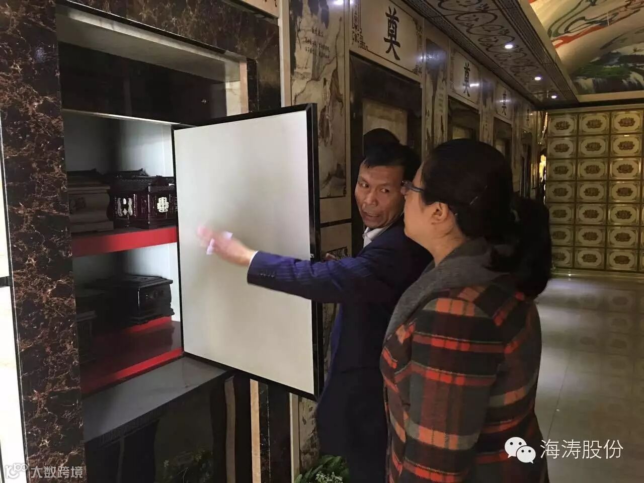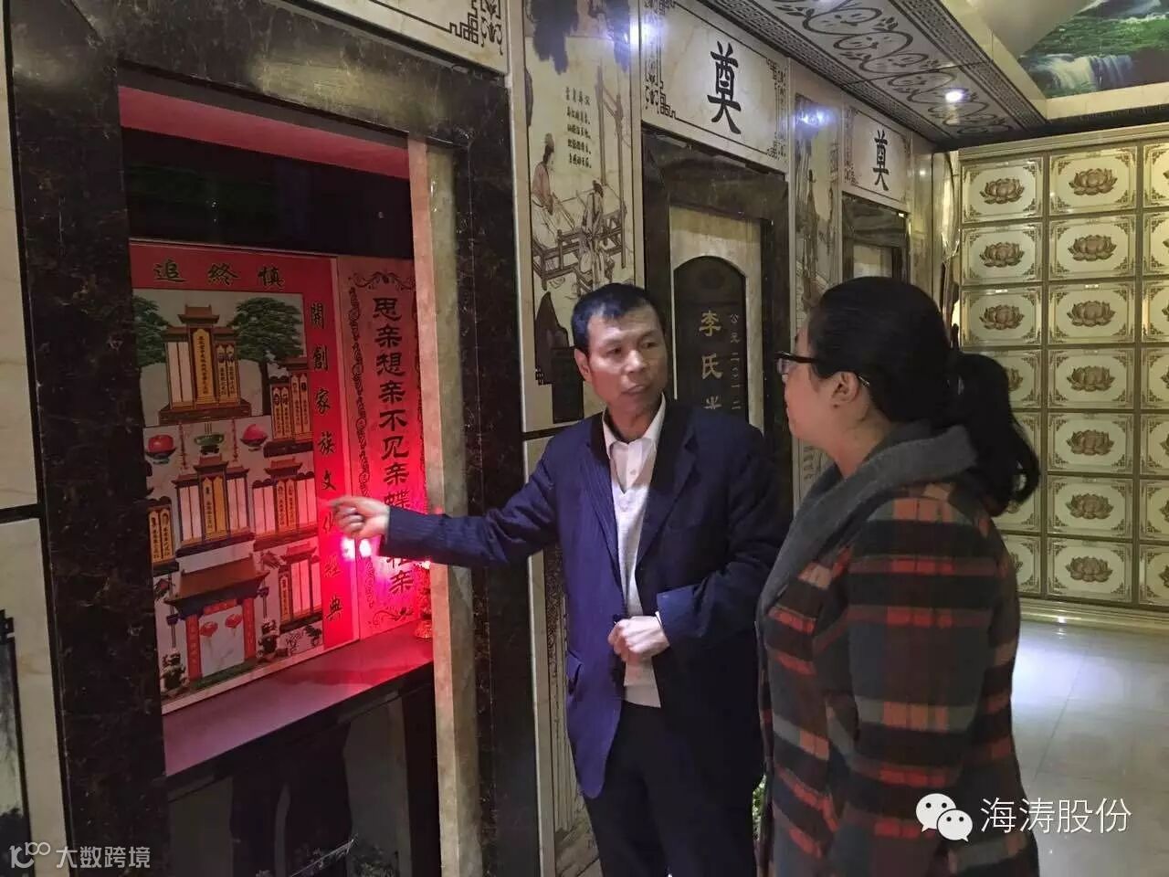 图为:孙董事长向北京社会职业技术学院老师介绍室内公墓全套设备