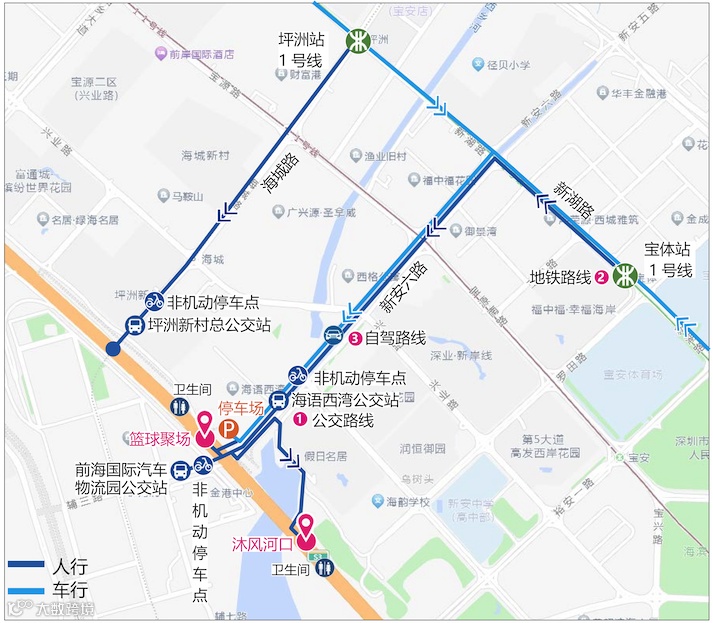 乘车到达海语西湾公交站、前海国际汽车物流园公交站下车,沿着新安六路人行道步行 300M 到达场地,预计人行4分钟到达。