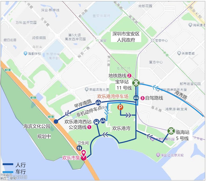 自驾到欢乐港湾停车场到达场地,再往人行道步行500M到达场地预计5分钟。