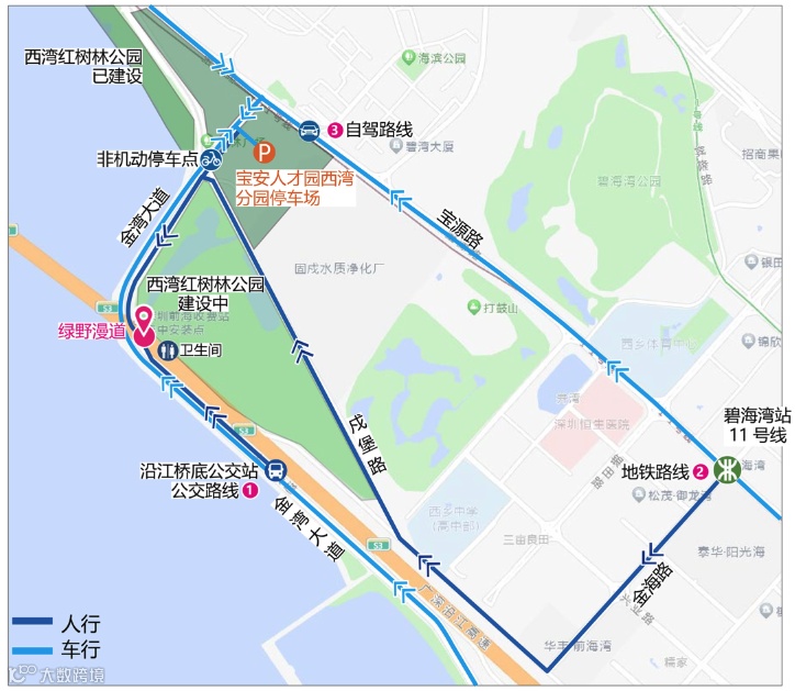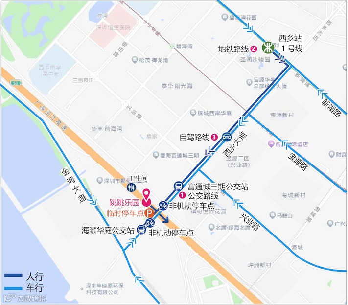 或自驾到达西乡大道辅路临时停车点后,沿着人行道步行到达。
