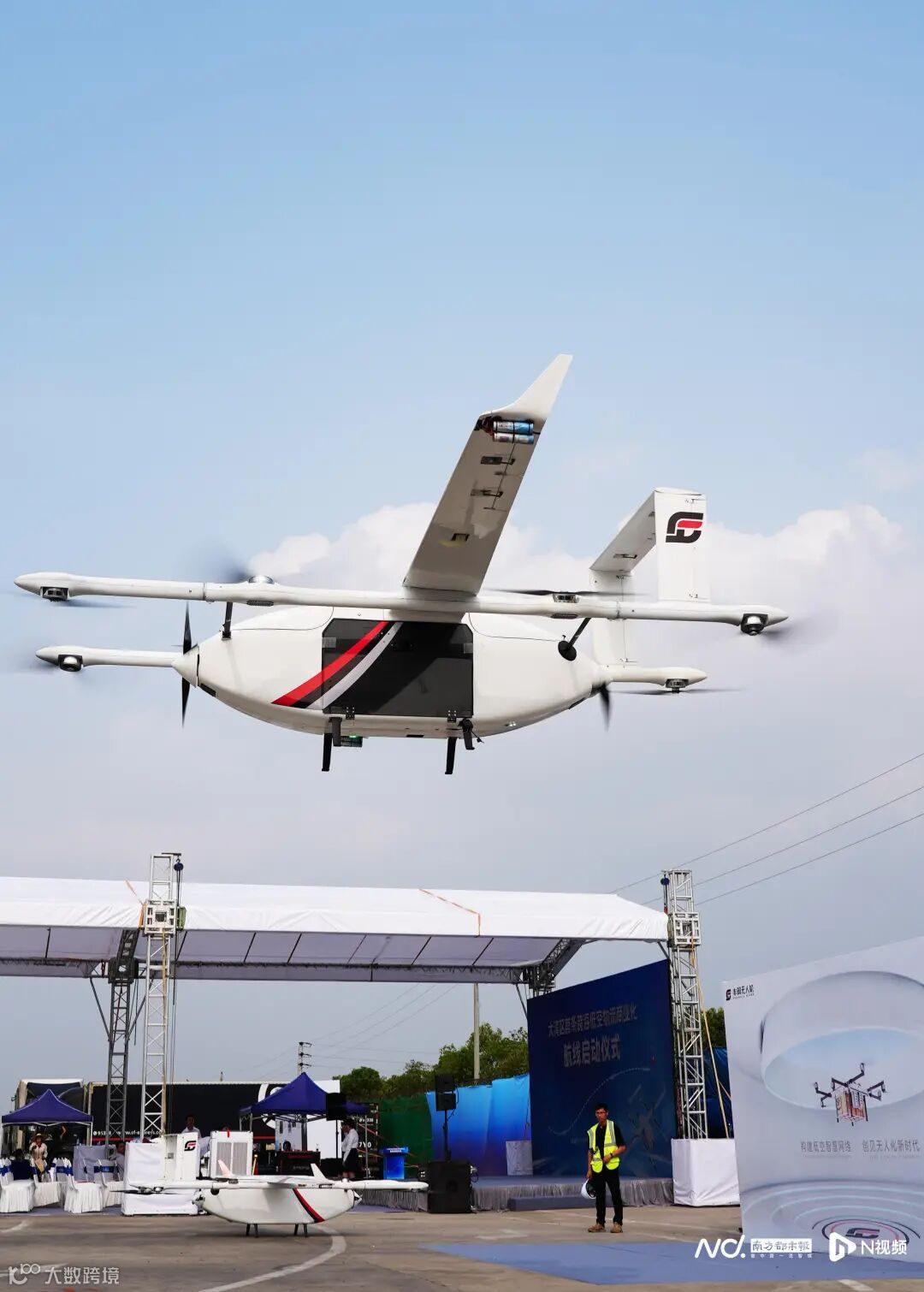 14:38,一架丰舟90型无人机从深圳蛇口赤湾港起飞,朝着珠江口西岸的中山飞去;15:00,70公里外的中山市小榄镇宏昌物流园,粤港澳大湾区首条跨海低空物流商业化航线启动仪式举行。此时,这架无人机飞跃在伶仃洋上空,俯视深中通道,犹如一只巨大的风筝架在海上,又像是一根月老的“红线”,将深圳、中山两座城市紧紧“系”在一起。15:17,比预计时间提早6分钟,这架丰舟90型货运无人机成功抵达启动仪式现场。
