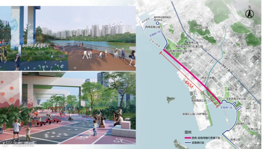 项目位于前海合作区宝中及西乡片区,北起金湾大道,南至欢乐港湾,全长约6公里,主要建设内容包括人行道、慢跑道、自行车道、配套设施、环境提升等。