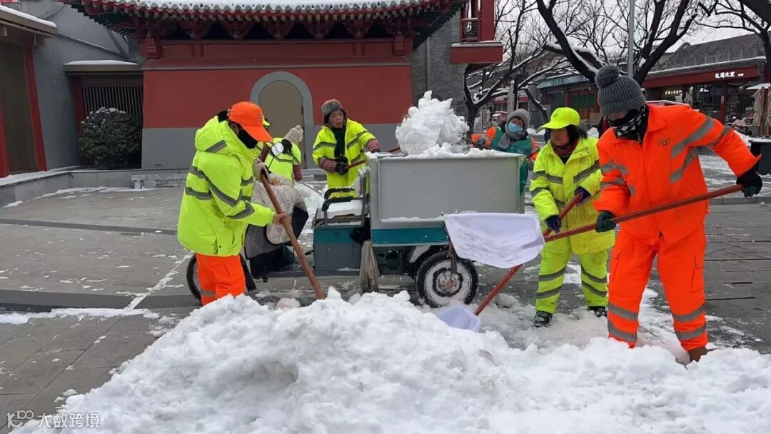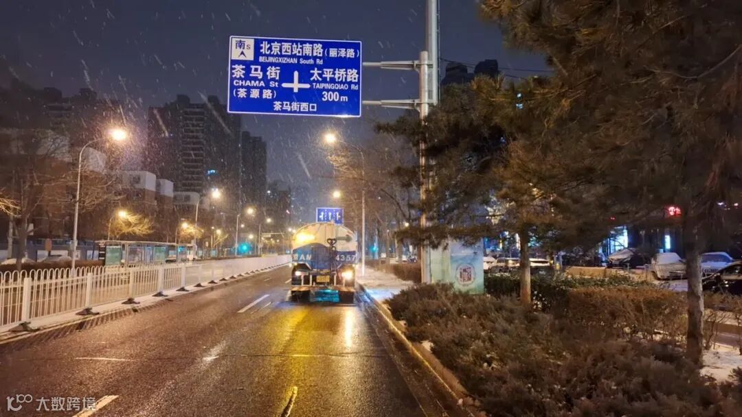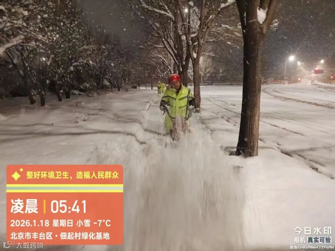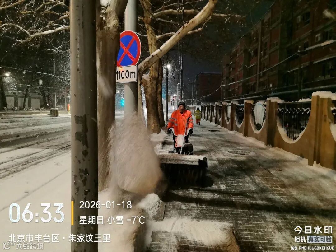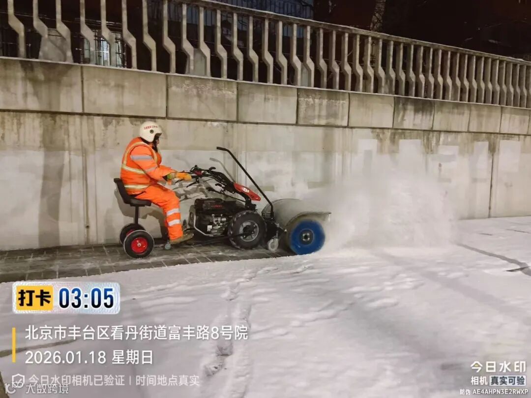 降雪开始后,夜间作业人员迅速投入行动,聚焦丰台区重点区域内容易打滑的路段,以及人流密集的地铁站、车站、小区出入口等关键点位,率先开展基础清雪工作。通过“优先保重点、及时除隐患”,为市民夜间临时出行及次日清晨通勤扫清初步障碍,用快速行动筑牢安全出行防线。