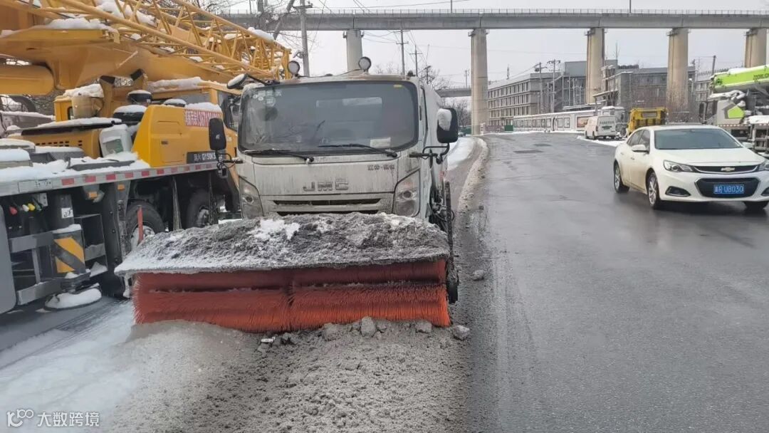 指令下达后,环卫工人、后勤人员及其他可调度力量立即集结到段,“人工+设备”协同的全面除雪行动即刻铺开。人工端,工作人员手持工具对重点区域“随下随扫”,细致清理每一处积雪;设备端,机械化除雪力量同步推进,以“滚刷+水车”的组合模式,对指定路段巡回开展融雪作业,人机联动大幅提升清雪效率。