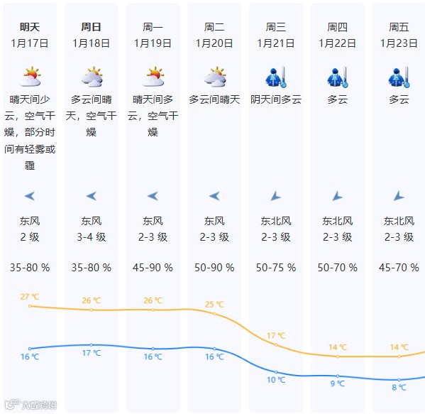17-20日晴天干燥为主,间中云量略多,部分时间有轻雾或霾,昼夜温差大,早晚清凉,白天温暖舒适,其中17日气温16-27℃。 -