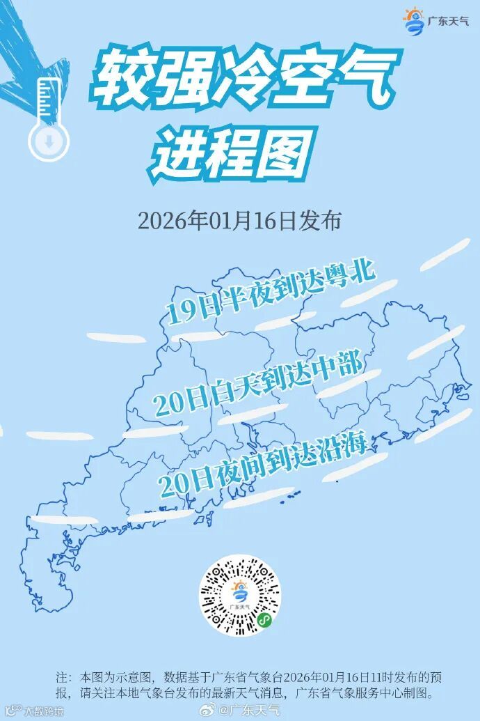 寒潮主体抵达广东后强度有所减弱,降为较强冷空气,具体影响节奏为:19日半夜到达粤北;20日白天到达广东中部,20日夜间到达沿海;后续持续影响广东,过程最低温可能出现在22日早晨。