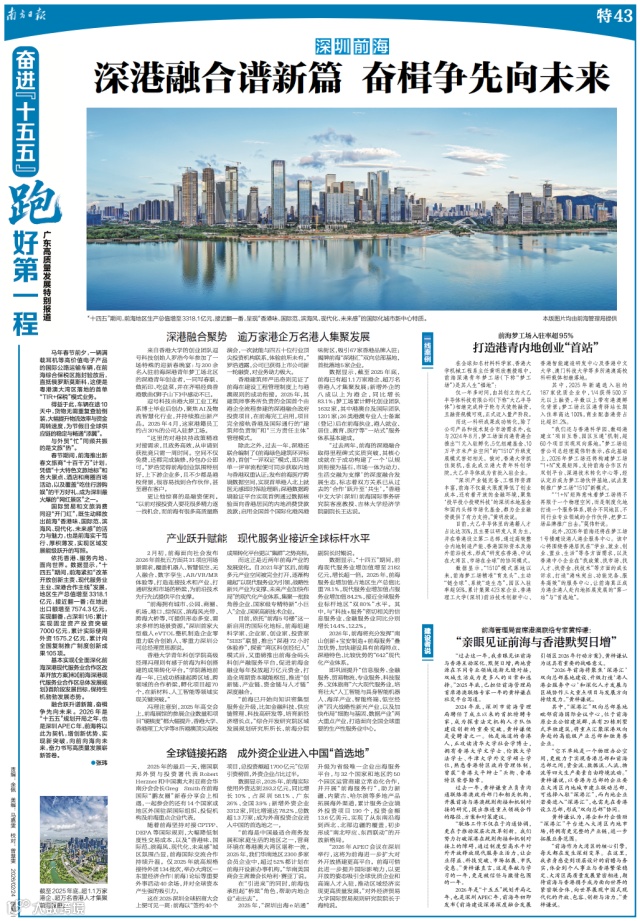 数据显示,截至2025年底,前海已有超1.1万家港企、超万名香港人才集聚发展;新增外企的八成以上为港企,同比增长83.1%;梦工场累计孵化创业团队1632家,其中港澳台及国际团队1201家;26类港澳专业人士备案(登记)后在前海执业,港人就业、居住、教育、医疗等“一站式”服务体系基本建成。