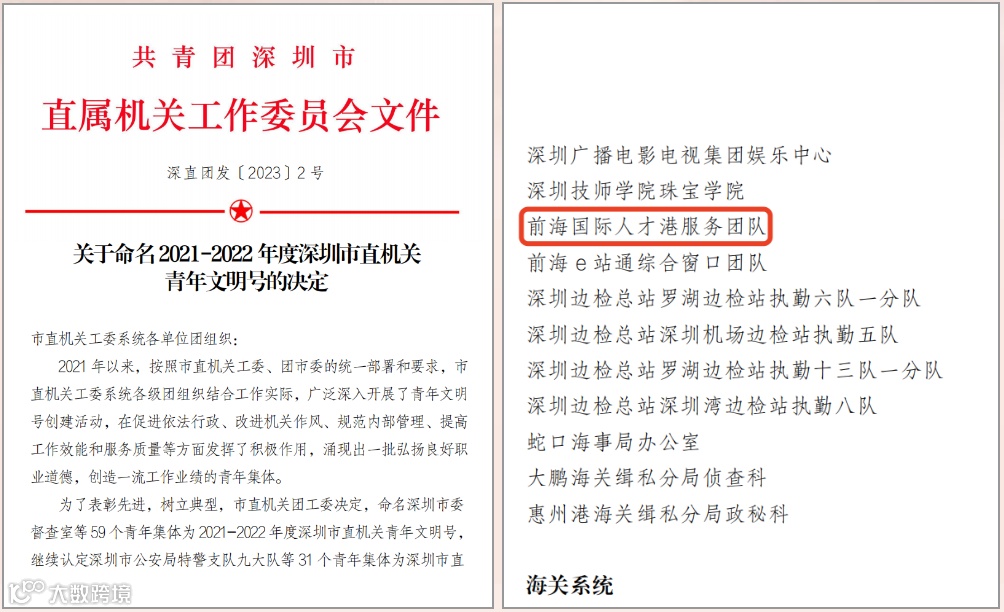 近日,共青团深圳市直属机关工作委员会公布了《关于命名2021-2022年度深圳市直机关青年文明号的决定》,前海国际人才港服务团队被授予“青年文明号”荣誉称号。