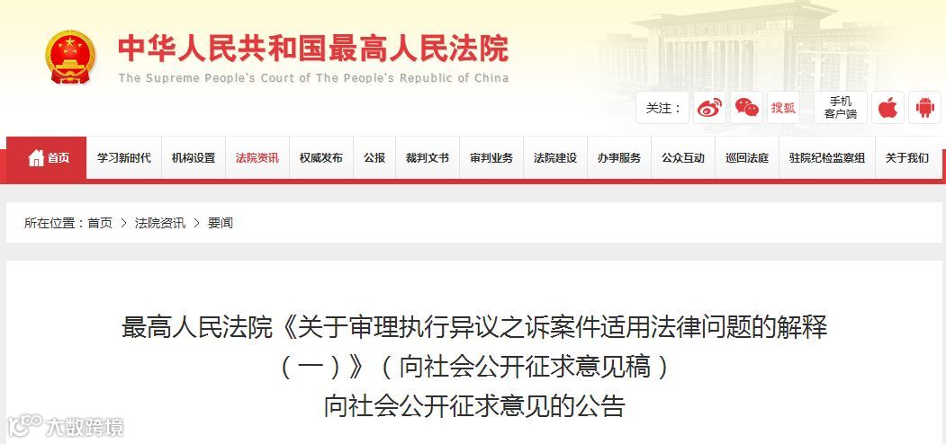 最高人民法院《关于审理执行异议之诉案件适用法律问题的解释(一)》(向社会公开征求意见稿)向社会公开征求意见的公告