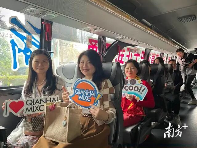 车上,来自香港的青年朋友手执卡牌,面带微笑,他们将跟随班车体验回港的舒畅旅程。