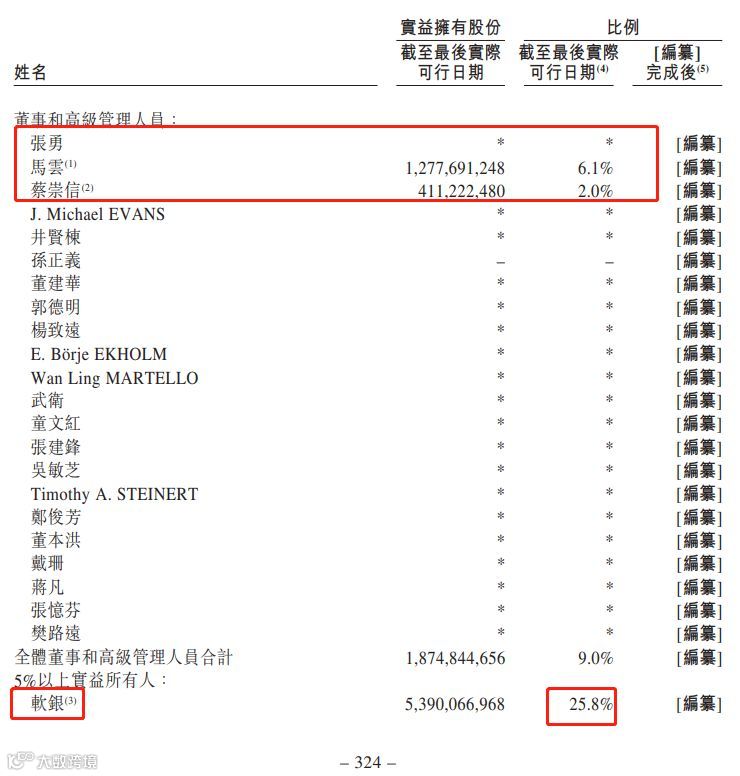截至最后实际可行日期,马云和蔡崇信分别实益拥有约6.1%和约2.0%已发行在外股份。截至最后实际可行日期,董事和高级管理人员(包括马云和蔡崇信)共计拥有约9.0%已发行在外股份。