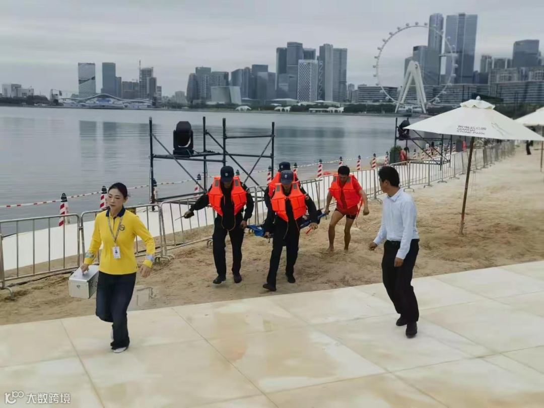 19时10分,气温仅10摄氏度,海水刺骨。安保班长黄宏安例行巡查至桂湾沙池南侧时,发现一名女游客跳海。他毫不犹豫地跃入海中施救,同时用对讲机呼叫周边岗位支援。接到呼叫后,周边安保人员不到一分钟便携带救生设备抵达,与黄宏安分工协作。19时13分,众人合力将女子救上岸,三分钟内成功化解危机,尽显团队训练有素、配合默契。