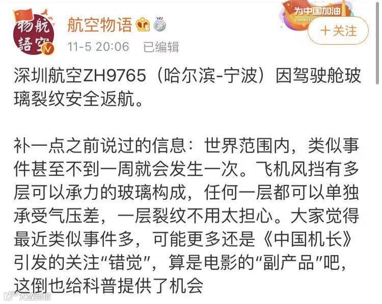 据航空知名博主@航空物语 介绍,客机风挡玻璃出现裂纹并不罕见,世界范围内类似事件甚至不到一周就会发生一次。飞机风挡有多层可以承力的玻璃构成,任何一层都可以单独承受气压差,一层裂纹不用太担心。