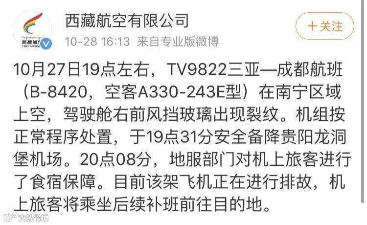 此前,相同情况也曾上演。10月27日,西藏航空TV9822三亚—成都航班,驾驶舱右前风挡玻璃出现裂纹备降贵阳。有乘客透露,备降期间无异常,落地后被通知航班取消。