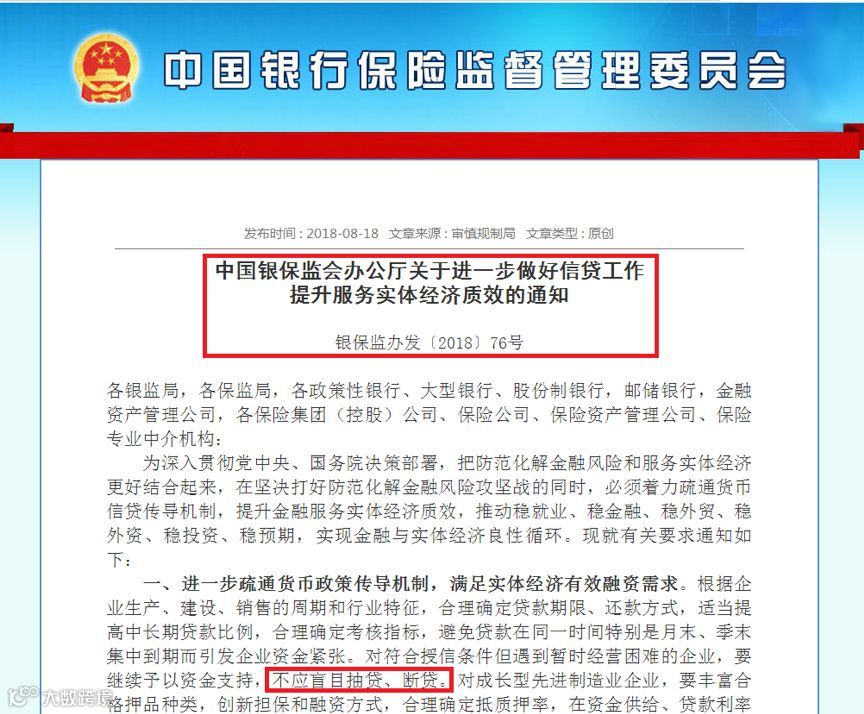 8月18日,中国银保监会发布《关于进一步做好信贷工作提升服务实体经济质效的通知》(为2018年的第76号文):对符合授信条件但遇到暂时经营困难的企业,要继续予以资金支持,不应盲目抽贷、断贷;按照市场化原则满足融资平台公司的合理融资需求,对必要的在建项目要避免资金断供、工程烂尾。