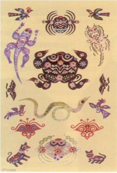 「五毒袋」:袋内装丁香、木香和白芷等草药,外绣蜈蚣、蝎子、蛇、蟾蜍、壁虎等五毒图案。旧时端午习俗,佩带五毒袋以祛除毒气。宫中五毒袋制作十分考究,除了具有实用意义外,五毒袋本身也是一件精美的工艺品。