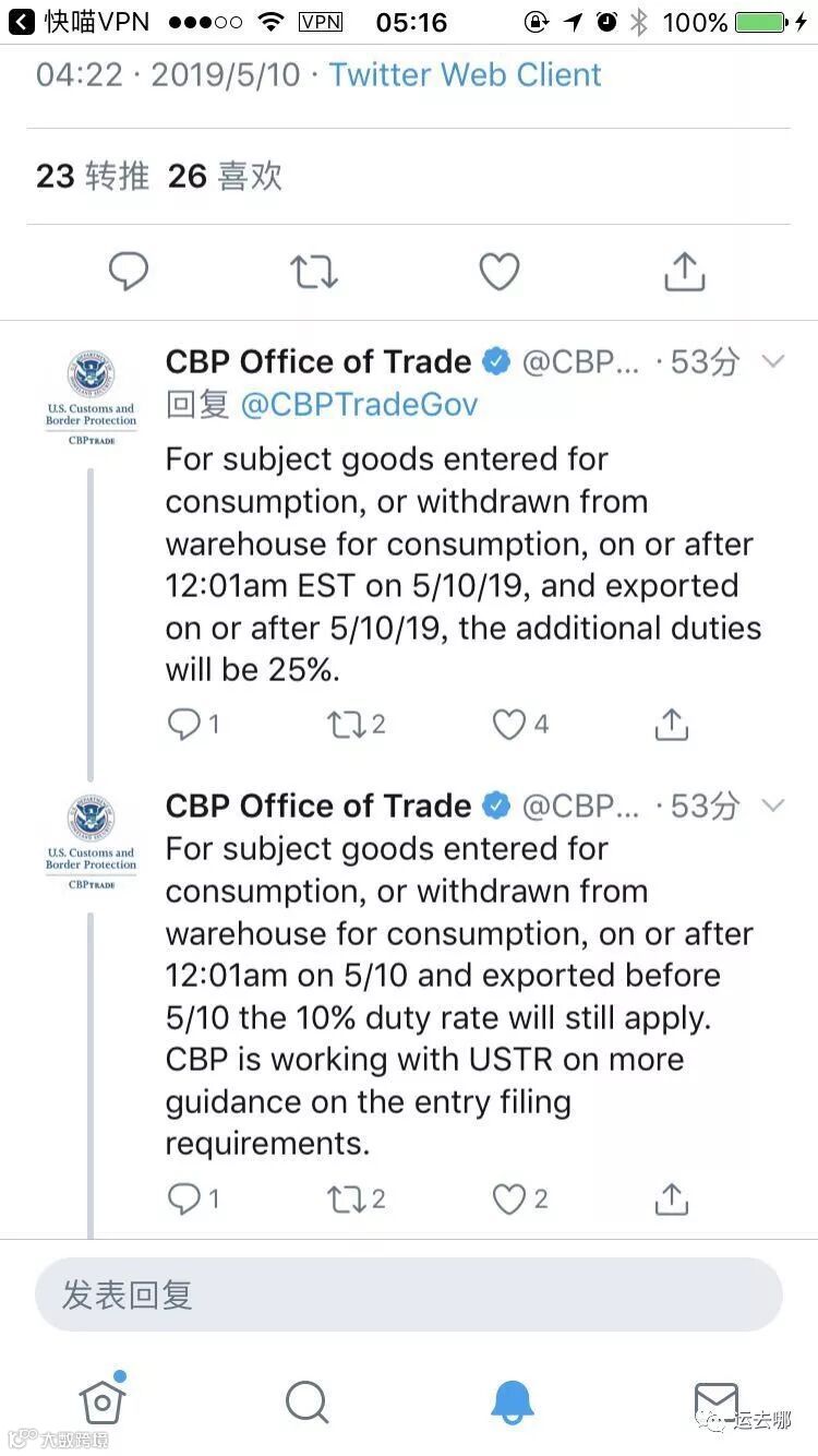 值得注意的是,根据CBP的说法,只要在5月10日前从中国出口了,即使货物还未抵港,仍可按照10%税率征收!对于这一点,建议各位外贸小伙伴尽快与美国收货人尽快核实操作细节!