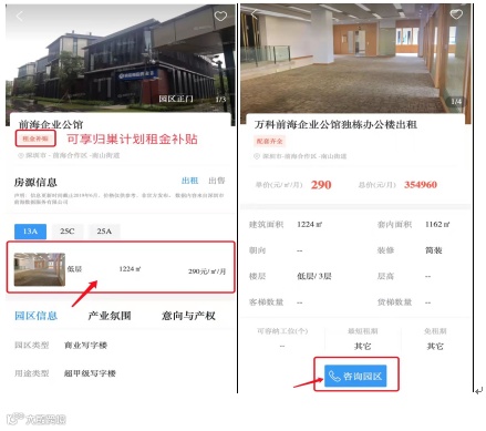 ◆ 有哪些空置房源、空置面积和价格、园区基本情况、产业氛围、意向与产权以及周边配套。从图一的位置进入,可查看房源详情信息(具体如图二),如对该房源满意,可直接点击「咨询园区」,获取园区电话直接联系,省去中间环节。