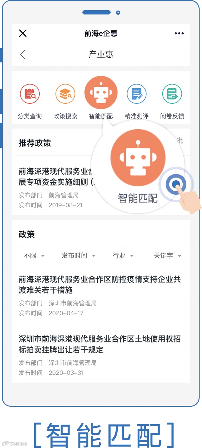◆ 如何找到?「e企惠」➤「产业惠」➤「点击任一政策」举例:前海深港现代服务业合作区防控疫情支持企业共渡难关若干措施 ➤ 「智能匹配」