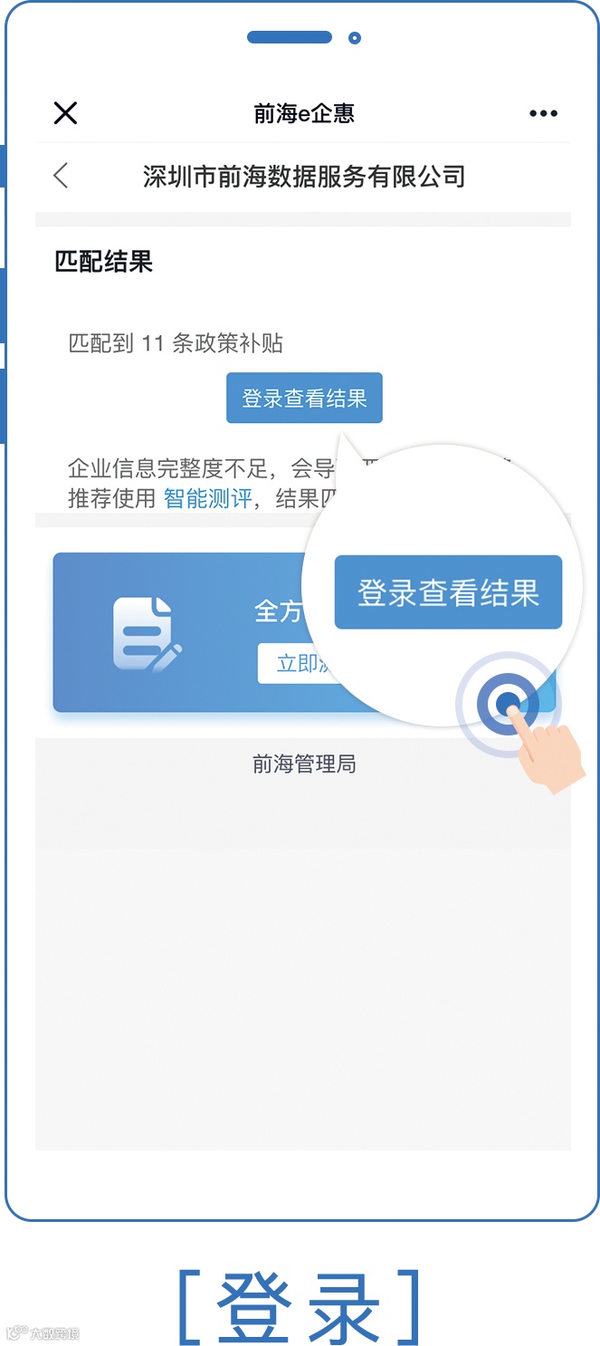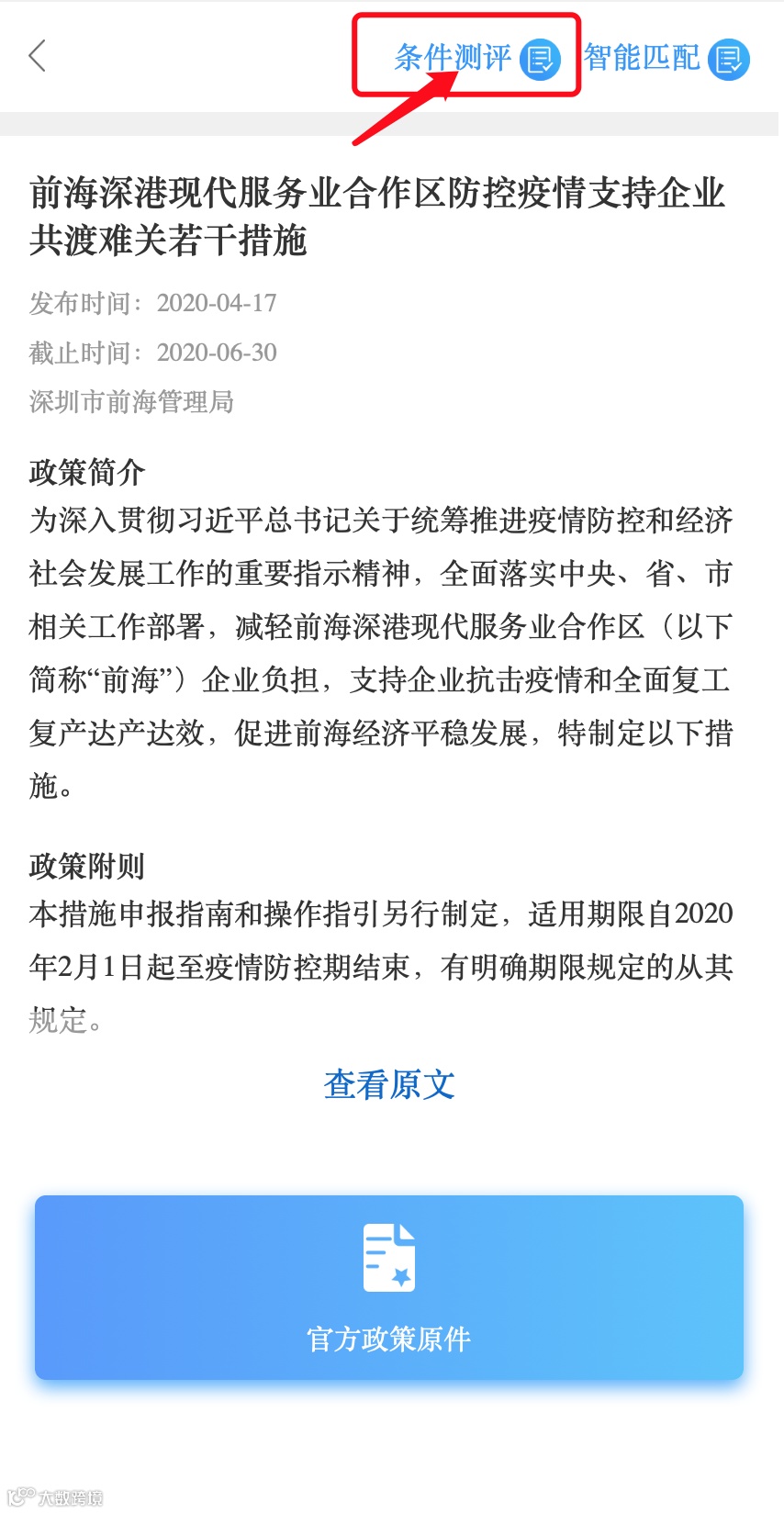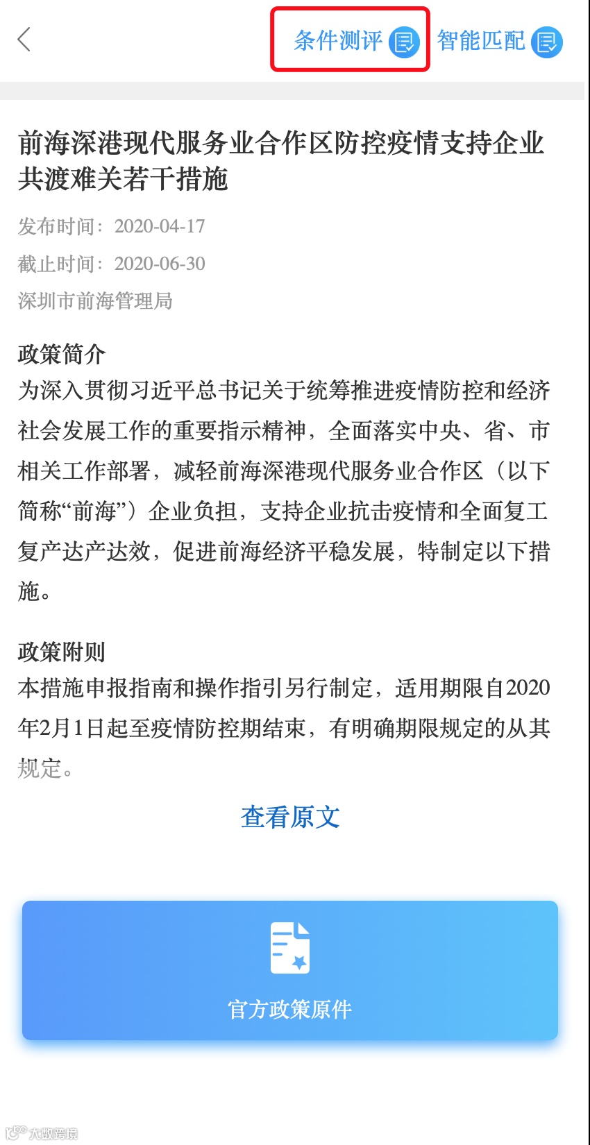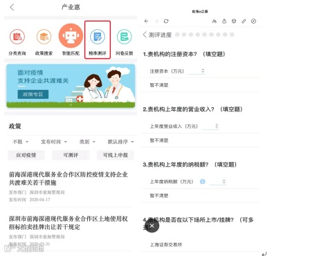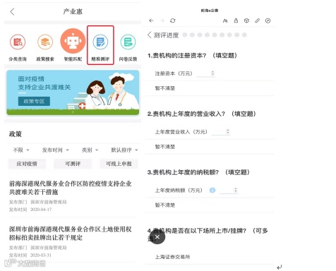 ◆ 如何找到?「e企惠」➤「产业惠」➤「点击任一政策」举例:前海深港现代服务业合作区防控疫情支持企业共渡难关若干措施 ➤ 「条件测评」