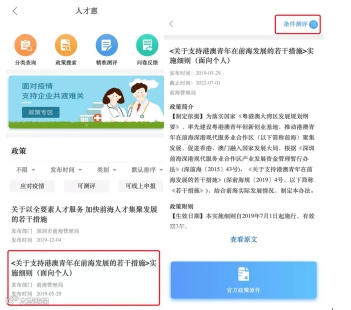 ◆ 如何找到?「e企惠」➤「人才惠」➤「点击任一政策」举例:<关于支持港澳青年在前海发展的若干措施>实施细则(面向个人) ➤ 「条件测评」