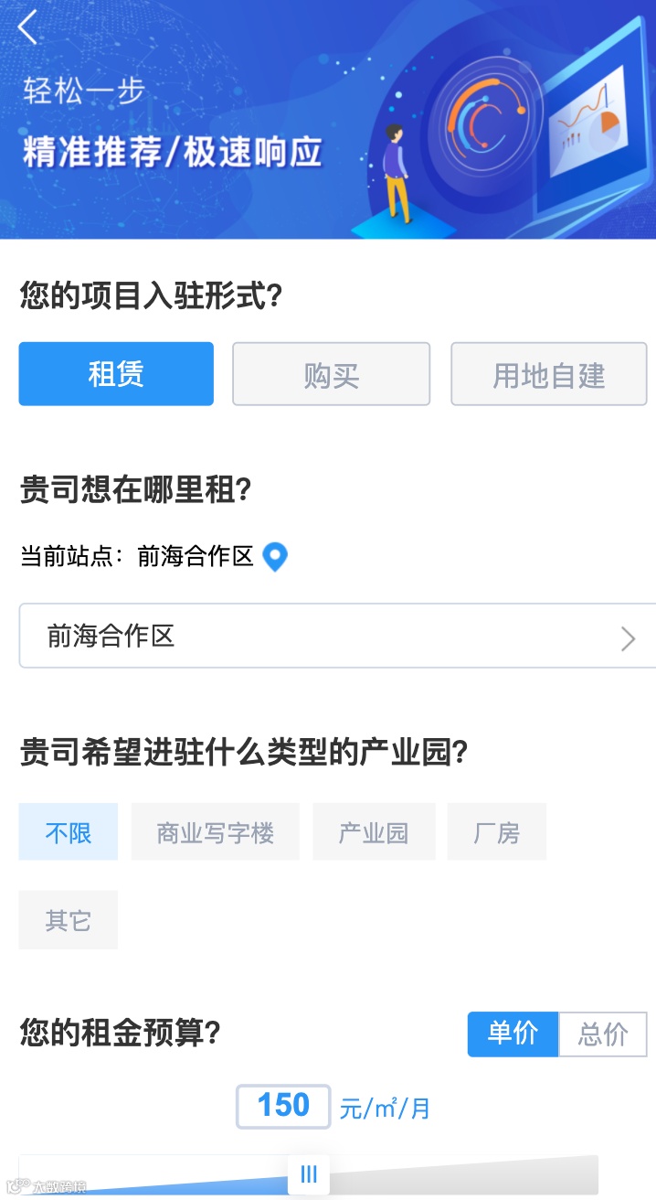 “e企惠”服务平台,基于对各级政府部门产业与人才扶持政策的归集和分析,以及对前海合作区范围内商业楼宇的房源采集,为片区企业提供扶持政策的精准匹配和办公房源的推荐服务。