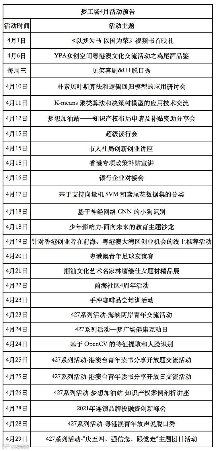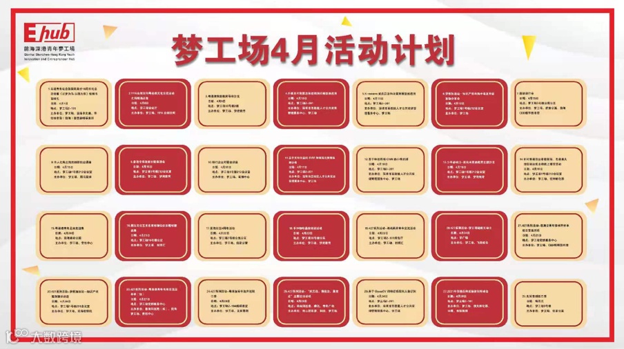 为打造活力园区,完善梦工场协同创业服务模式,更好服务园区深港创业青年,梦工场事业部携手园区孵化机构及团队打造多样化、 优质化、 特色化、 品牌化的园区服务活动,在4月拟办创新创业活动共计28场次,涵盖创业政策解读、行业技术分享、投融资对接、对港宣传推介、体育团队活动等,欢迎小伙伴们报名参加。活动报名:冯女士,电话:88980801。
